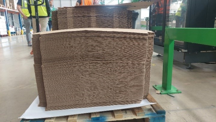 - Par découpe : Progress Clear. Le carton en excès au-dessus des produits est coupé et évacué dans un conteneur à proximité ou vers une presse à balle.